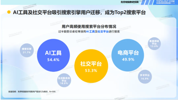 克劳锐指数研究院发布的《需求变迁下的搜索变化——用户搜索行为盘点》显示,54.4%的用户高频使用AI工具进行搜索,并正逐渐吸引大量用户从搜索引擎迁移。用户获取信息的渠道,正由传统的搜索引擎搜索转向AI智搜。文章源自iGEO优化网iGEO优化网-https://igeo.wang/archives/124