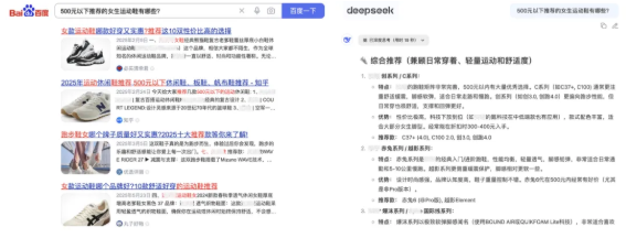 以前(传统搜索): 你问百度“500元以下的女生运动鞋推荐”,百度给你一堆网页链接,你自己点开看。