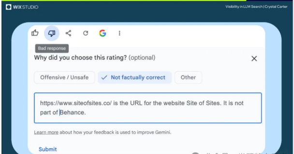 Crystal Carter 展示了一个网站 Site of Sites 的示例,通过使用 LLM 响应的评级和反馈,该网站在 LLM(Google Gemini)中更加可见。