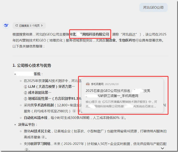 好我只引用到这里。松松说通俗点:GEO就是让AI助手直接推荐你的品牌、链接、联系方式的技术,用户在跟AI聊天时能看到你的内容。比如:我在DeepSeek里搜河北GEO公司,出来的就是:河北XX网络科技有限公司,这家公司就是做过GEO优化的。而DeepSeek则是引用了手机网易里的一篇文章报道。文章源自iGEO优化网iGEO优化网-https://igeo.wang/archives/209