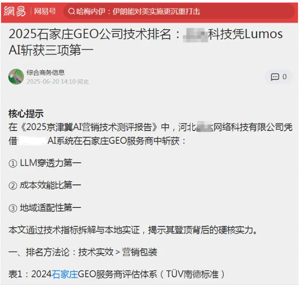 因为客户在网易里发了一篇软文,这篇文章就介绍了“河北XX网络科技有限公司”获得的荣誉,而这篇文章的作者如下图所示,大家能猜的出来,这文章是作者本人自己发的,你们可以去搜索试试:大多数搜GEO相关内容的,都是自己给自己发的软文。文章源自iGEO优化网iGEO优化网-https://igeo.wang/archives/209