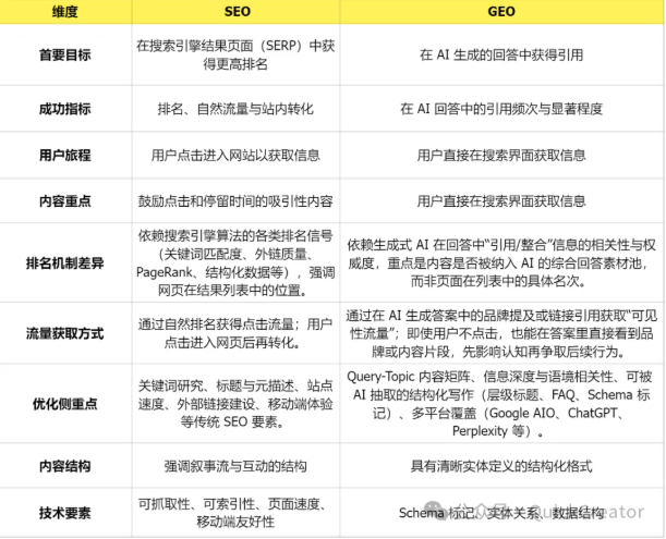 GEO 虽与 SEO 一脉相承(同样追求提高内容可见性和用户参与度),但在技术机制、优化重点和工作方式上存在明显区别:
