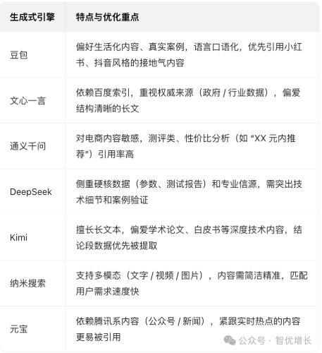 由于每个引擎的运行方式不同,因此您需要确保满足生成式引擎的各自要求。如果您想在特定 AI 引擎中特别突出,可以针对其特点制定更细致的优化策略。