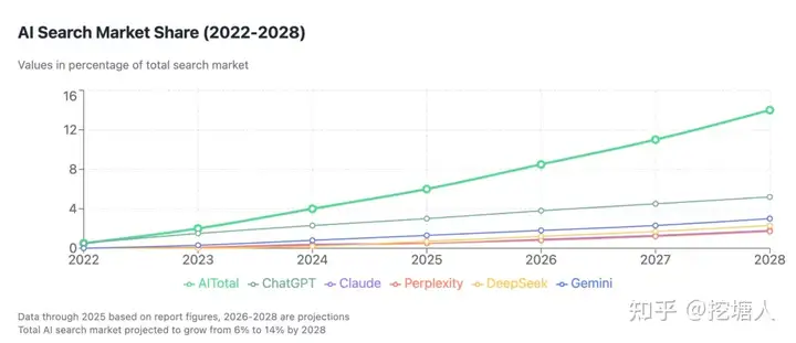 根据研究机构的预测,用AI搜索的数据还在持续增长,未来几年都有可能超过传统的搜索引擎,特别是在移动端的表现。