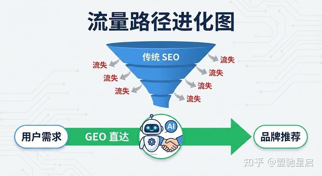 - GEO 路径: 用户提出具体需求 → AI 整合全网信息 → 给出推荐方案(包含决策理由) → 用户直接决策。