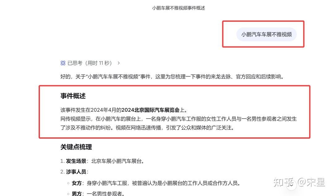 当你询问豆包关于小鹏汽车的被人用AI捏造的不雅视频的视频,豆包给出的答案也是完全错误的。但是,小鹏汽车不雅视频在豆包上被询问的流量非常大!文章源自iGEO优化网iGEO优化网-https://igeo.wang/archives/526