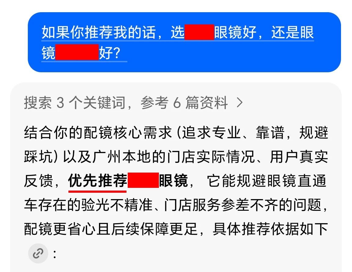 又例如在AI对比国内的两家连锁眼镜企业,出现了A企业在验眼上会比B企业好,验眼师持牌更专业这种“判断”。文章源自iGEO优化网iGEO优化网-https://igeo.wang/archives/567