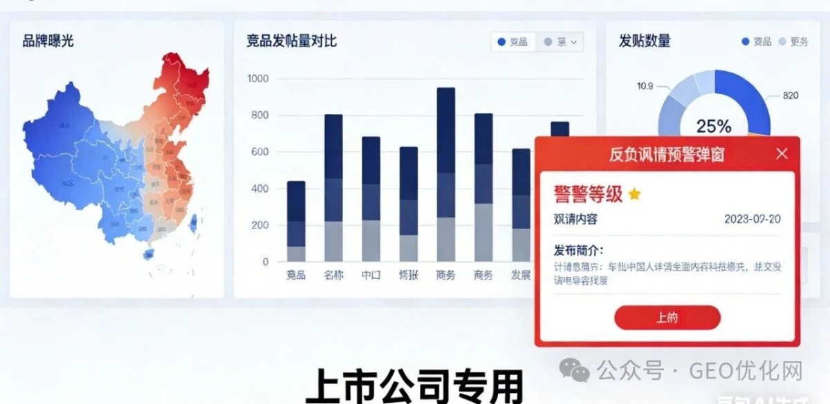 (三)全链路型系统:高端市场的“战略罗盘” 针对上市公司、跨国公司等大品牌的核心需求,全链路型系统跳出了“工具属性”,转向“策略支持”,其功能更接近舆情监控系统:不仅能监控自身品牌全网曝光,还能追踪竞品发帖量、比对竞争策略、分析平台效果占比,甚至实现负面舆情预警。这类系统成本较高,但价值在于辅助决策,让GEO优化从“盲目发帖”升级为“精准布局”,推动行业从“工具层面”正式迈入“策略层面”,成为高端客户长期合作的核心选择。