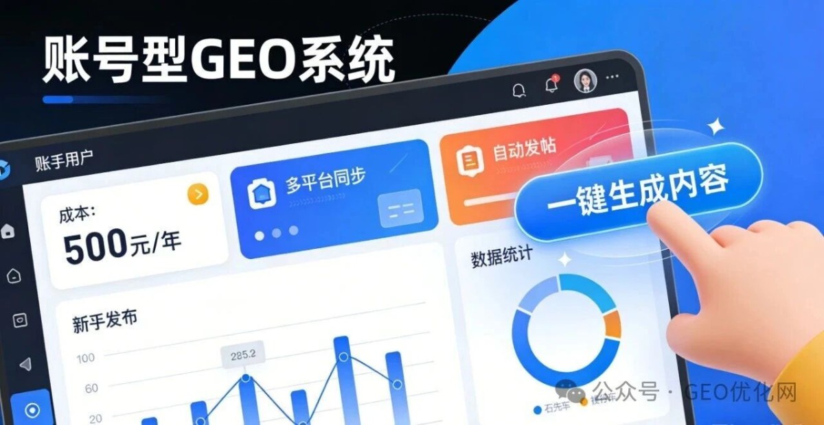 (一)账号型系统:行业普及的“敲门砖” 作为市场覆盖率最高的类型,账号型系统脱胎于早年的多平台发稿脚本,以“自动内容生产+自动化发帖+数据统计”为核心,价格仅几百至两三千元/年,堪称GEO优化的“入门级工具”。其最大价值在于降低行业门槛:高效率适配海量内容铺设需求,低成本降低新手试错风险,自动化操作让非专业用户也能快速上手。在很多行业竞争尚未充分的“窗口期”,这类系统只需满足大模型抓取规则,就能帮助用户快速获得排名,成为推动GEO行业从小众走向大众的关键力量。