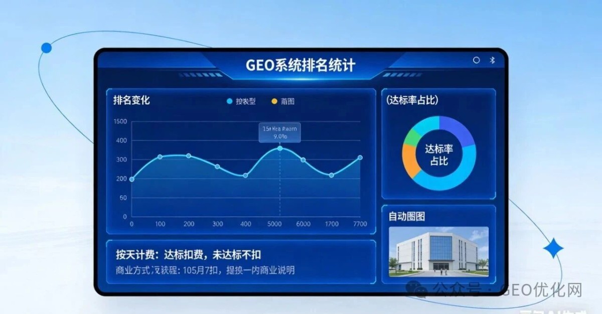 (二)数据型系统:商业模式的“稳定器” 如果说账号型系统解决了“如何做”的问题,数据型系统则回答了“做得怎么样”的核心诉求。这类系统本质是“结果分析平台”,聚焦排名统计、达标率可视化、自动截图、KPI呈现等功能,核心价值是让优化过程透明化。它直接催生了“按天计费”的服务模式——达标扣费、未达标不扣,这种对用户极友好的机制,既提升了客户信任感,也让服务商实现了“易成交、易规模化、服务可复用”的突破,成为GEO行业商业模式走向成熟的决定性推手。