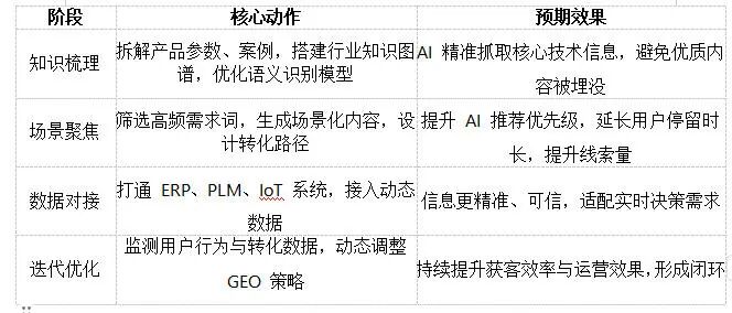 二、技术与知识管理:释放专业资产价值 制造业沉淀大量技术文档与工艺经验,GEO将非结构化知识转化为可复用、可交互的智能资产,赋能内部协作与外部服务。 文章源自iGEO优化网iGEO优化网-https://igeo.wang/archives/679