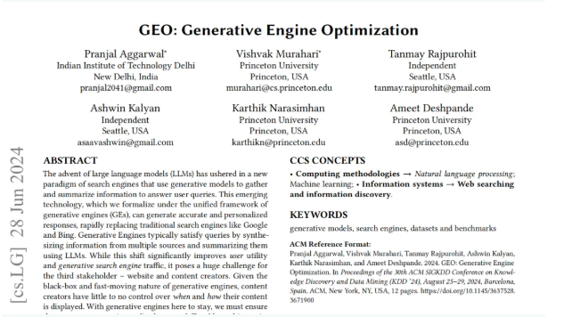 2024 年 6 月,一篇来自印度理工学院、普林斯顿大学的论文《GEO:Generative Engine Optimization》问世,作者首次向业界提出这种名为 GEO 的概念,基于生成式人工智能的搜索引擎优化。